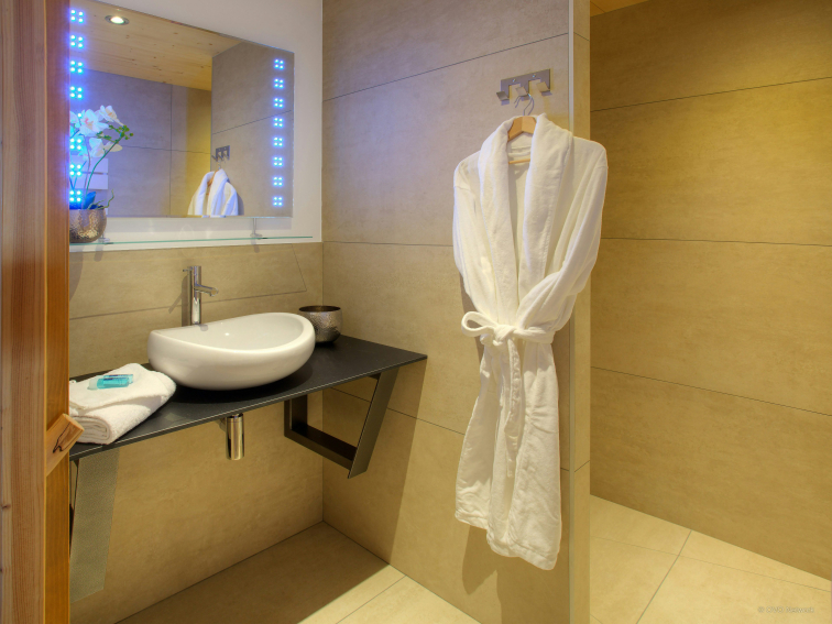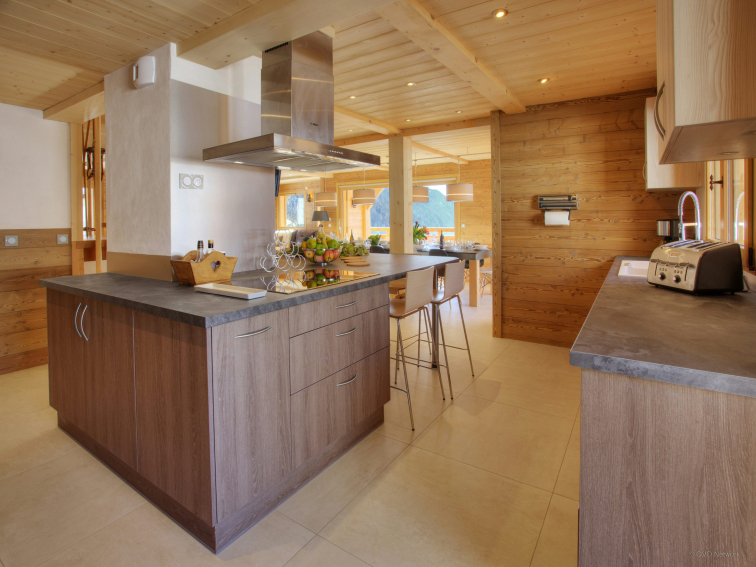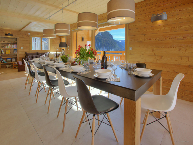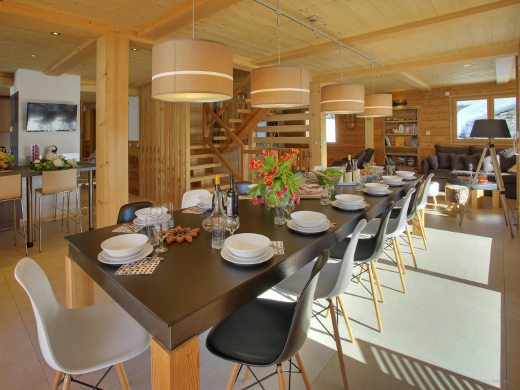 The two lounge areas are equipped with a bar, a dance floor and a comfortable sitting area near the fireplace. The fully equipped kitchen opens onto the dining area, which can accommodate all guests around the table. Large windows open onto the terrace. There is also a shower room on this level and separate toilets on each floor. The ski room has a boot dryer and storage for your equipment. A secure bike shed is available with charging points for electric bikes.