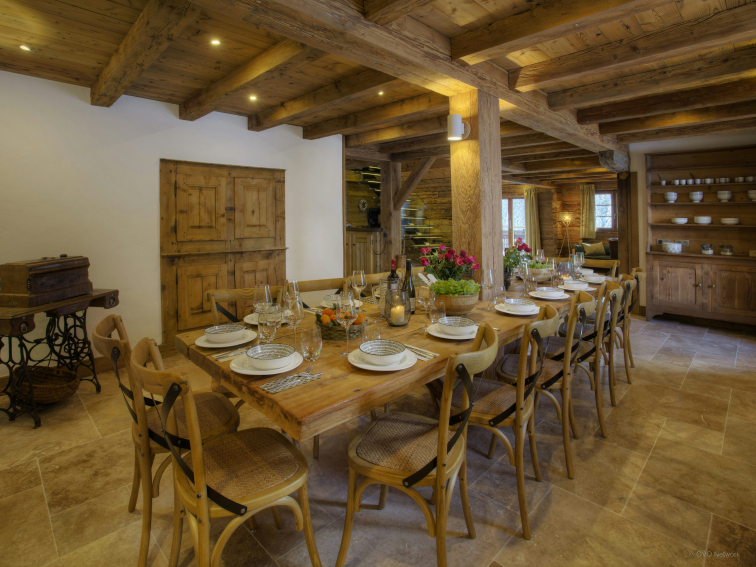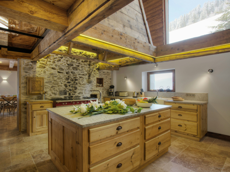 This spacious home is spread over three floors. The main entrance is on the ground floor and leads into a hall with dressing room and then into the very large living area. The large kitchen is arranged around a beautiful original fireplace, running through the height of the chalet, up to the roof. You will have all the space you need to cook on the large piano and on the large central island.