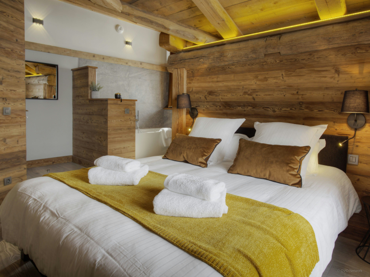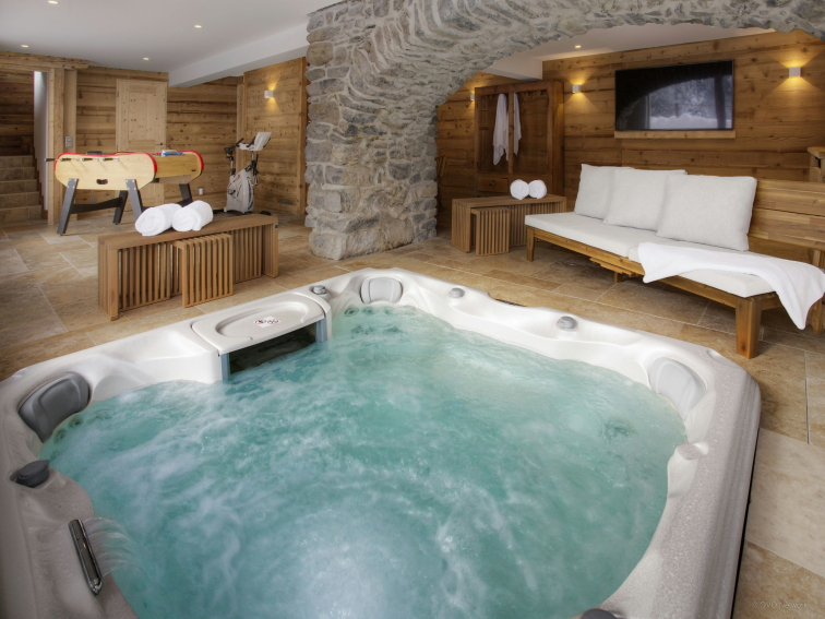 On the garden level, you will find a wine cellar, a large ski and bike room with heated boot rack, a technical room dedicated to skiing but also a magnificent wellness area, with bike, carpet, table football, large sauna and shower room. The jewel in the crown is the sunken jacuzzi, surrounded by floor-to-ceiling windows with views of the mountains and lifts. It's a wonderful place to relax at the end of an intense day.
