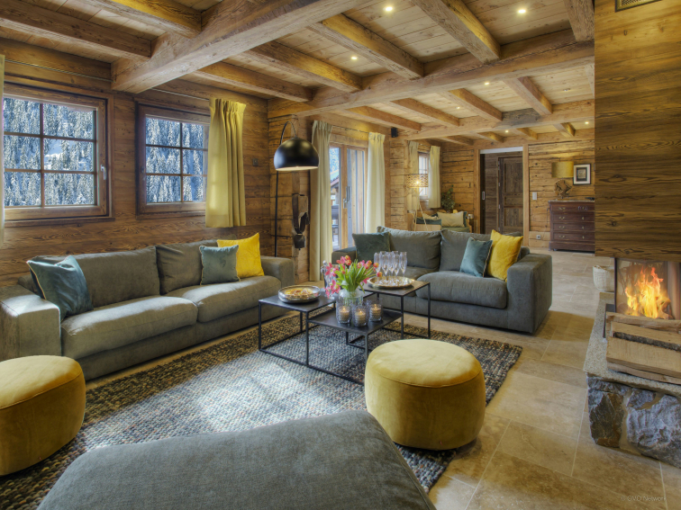 The large table was custom made from the wood of the old chalet. After a meal shared together, you can meet by the fire in the cosy living room to talk about your day or watch a film. Both the dining and living areas have access to separate balconies and the flat garden, where you can also barbecue or sunbathe.