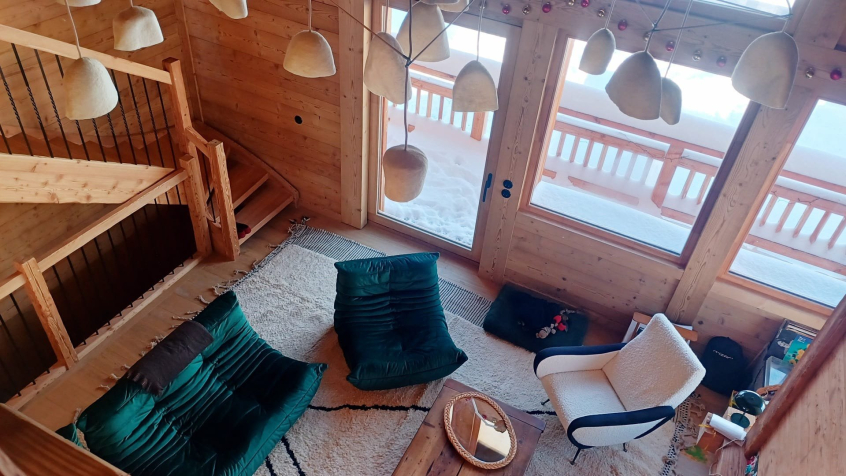 The chalet faces the Aravis mountain range, offering breathtaking panoramic views.
