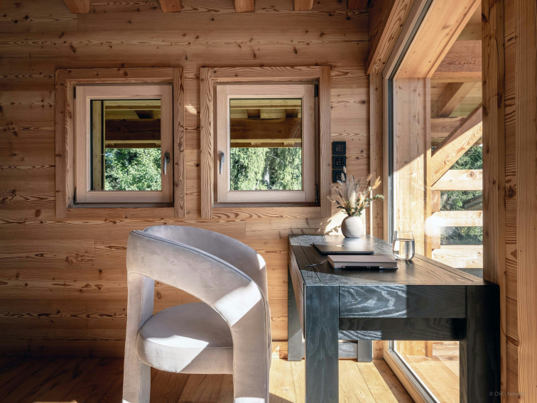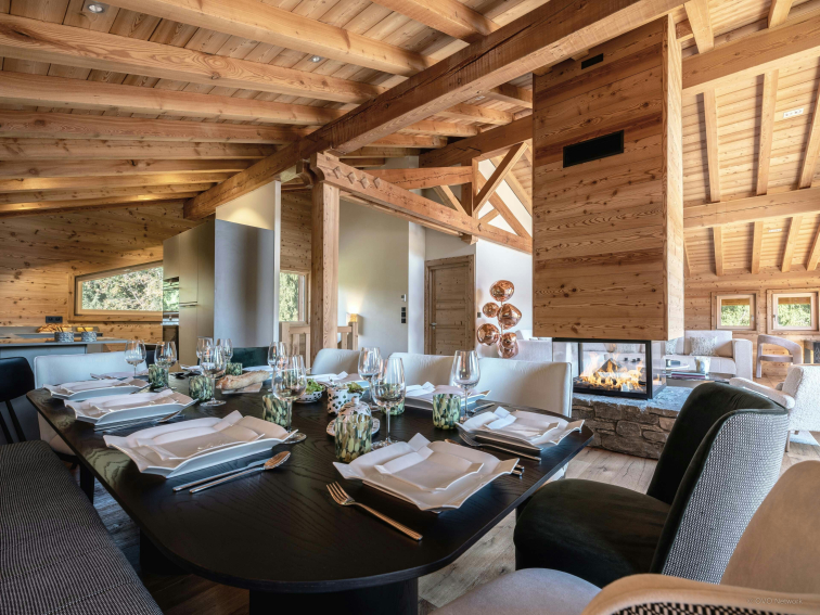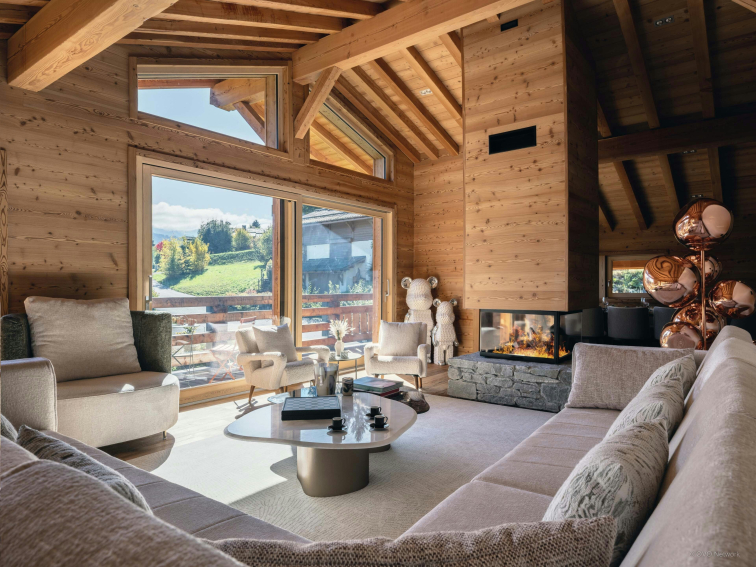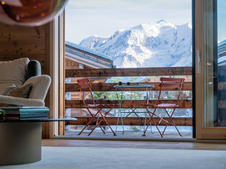 The spacious living room on the top floor is particularly welcoming, with comfortable armchairs and sofas, a central fireplace and plenty of natural light. Large bay windows open onto a balcony with views of the Mont-Blanc massif.