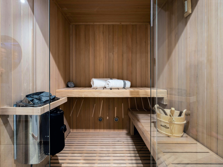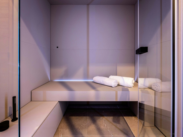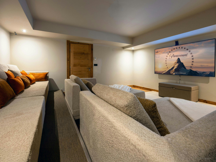 You won't find a TV in the living room, but a comfortable cinema room has been set up on the garden level. This level also includes the wellness area, with sauna and steam room for relaxing at the end of the day, as well as a functional ski room and laundry room with washing machine and dryer.