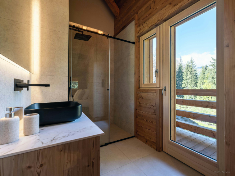 Four of the five bedrooms on the three levels have en-suite shower rooms. The three rooms on the middle floor also offer access to a wooden terrace. The last room, a delightful dormitory for six on the garden level - comprising a double bed and two bunk beds - is connected by a corridor to a shower room and separate toilet. For your convenience, each floor of the chalet has its own toilet.
