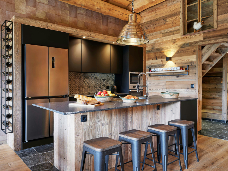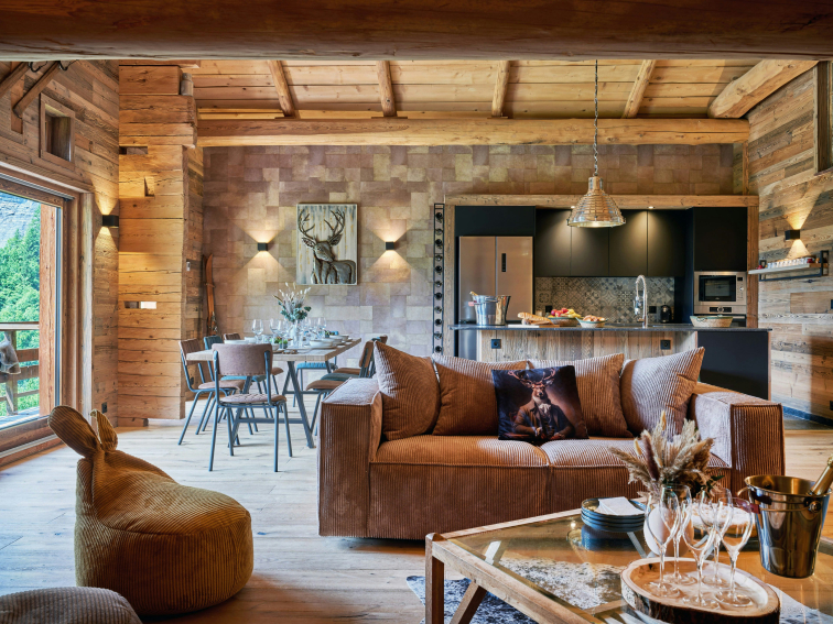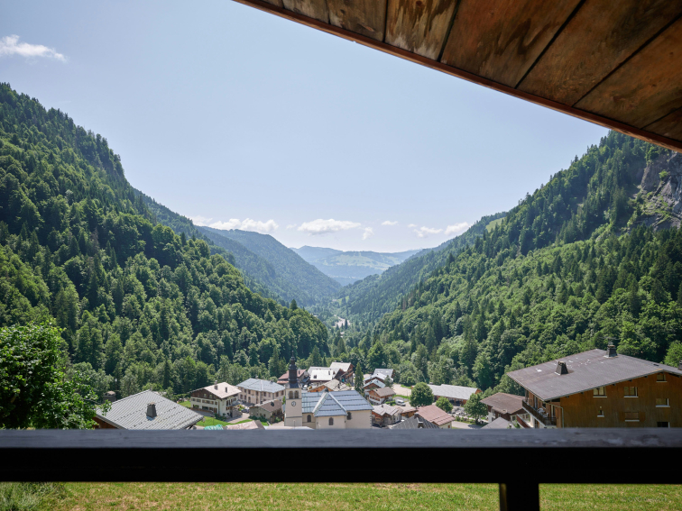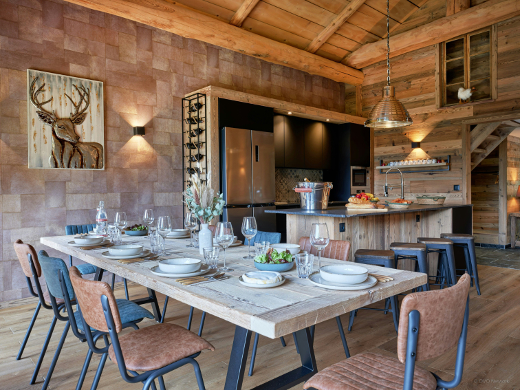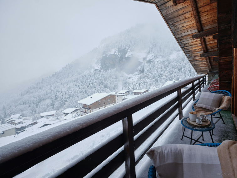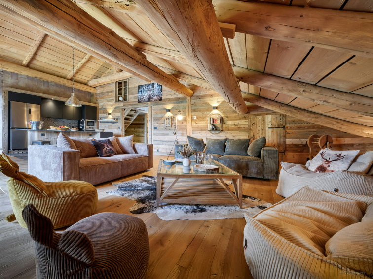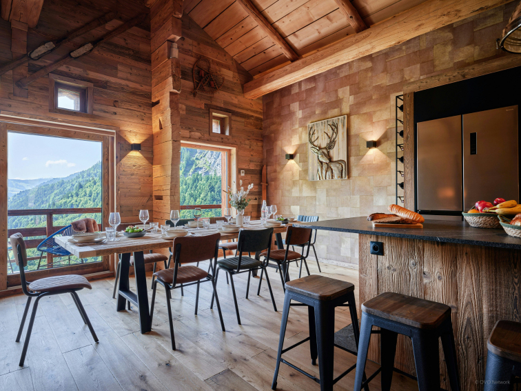 As soon as you step inside, you'll be seduced by the warm, Savoyard-style living room. It features a convivial living room with TV, a large dining table and a compact, well-equipped kitchen. A large bay window opens onto a balcony furnished with armchairs, where you can enjoy a breathtaking view of the valley.