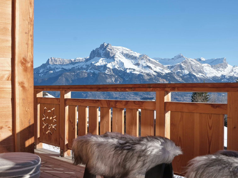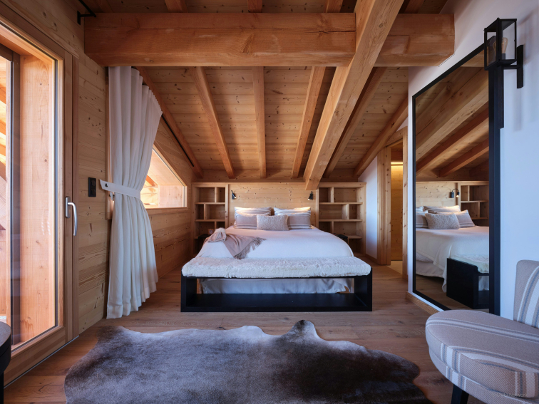 Its large, open-plan living area is the heart of the chalet. Facing the mountains, it benefits from plenty of natural light and balconies that naturally extend the space outwards. Its central fireplace will warm up evenings spent in the two living rooms. The kitchen is fully equipped, and the dining table is large enough to accommodate the whole family.