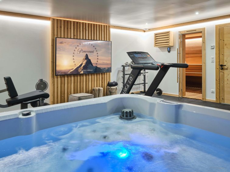 After a day in the great outdoors, you'll particularly appreciate the wellness area on the lower floor. Its sauna and Jacuzzi provide the perfect break from the stresses and strains of everyday life, while the fully-equipped home cinema offers a cosy atmosphere. The chalet's sports equipment (weights, leg curl, treadmill, exercise bike) means you can keep fit even when you're not out and about.