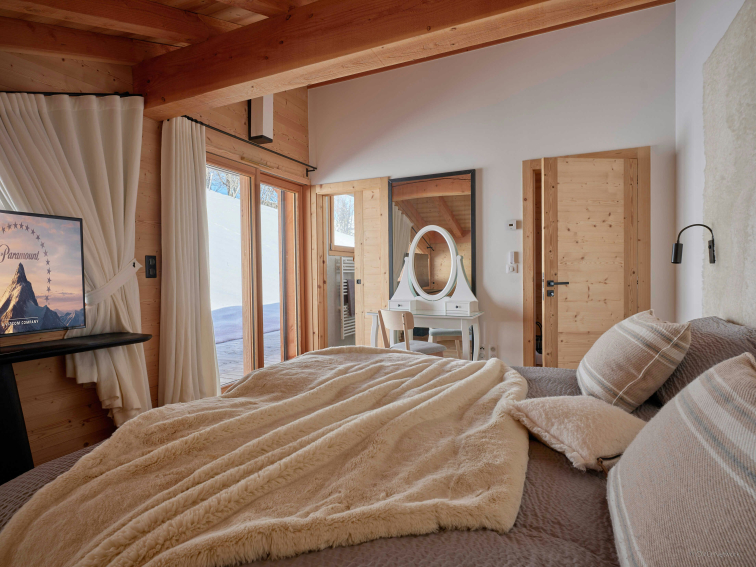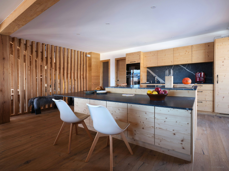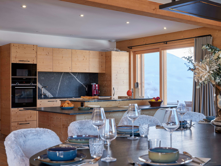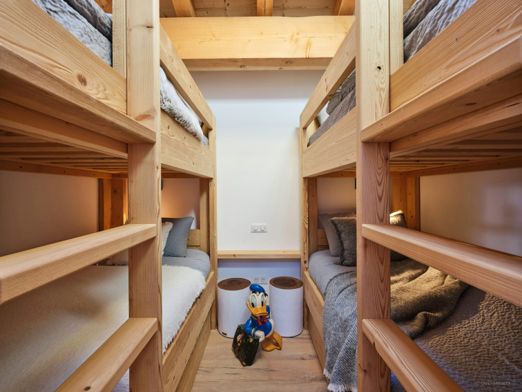 Its large, open-plan living area is the heart of the chalet. Facing the mountains, it benefits from plenty of natural light and balconies that naturally extend the space outwards. Its central fireplace will warm up evenings spent in the two living rooms. The kitchen is fully equipped, and the dining table is large enough to accommodate the whole family.