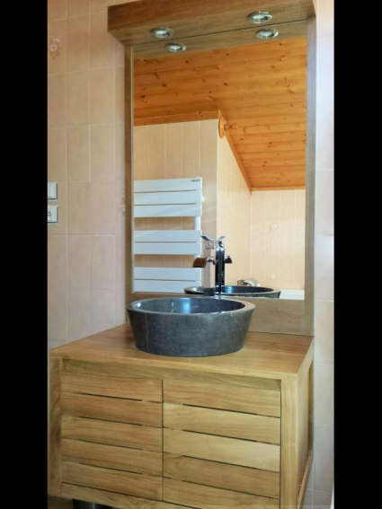 - A main room with kitchenette equipped with dishwasher, oven, microwave, hob, fridge and lounge area, TV, Wifi network, DVD, sofa, armchair + wooden furniture