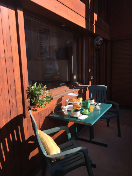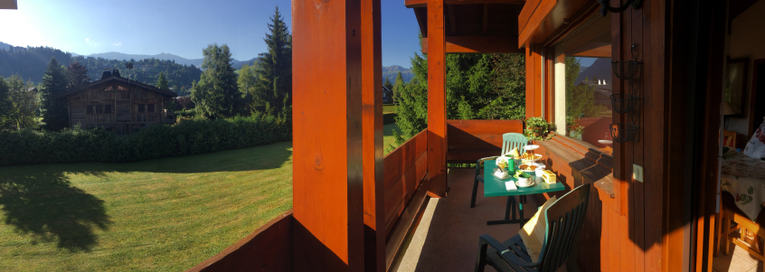 Belle pièce à vivre ensoleillée comprenant une cuisine entièrement équipée (plaques, four, lave vaisselle, réfrigérateur, micro-ondes, bouilloire, machine à café et moka pour café italien) et un salon/salle à manger avec une belle baie-vitrée et vue sur la montagne et les chalets. Le grand balcon est équipé d'une table et chaises longues.