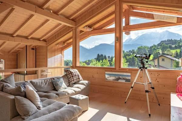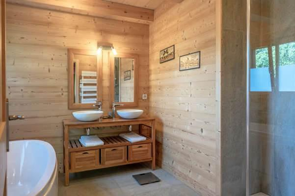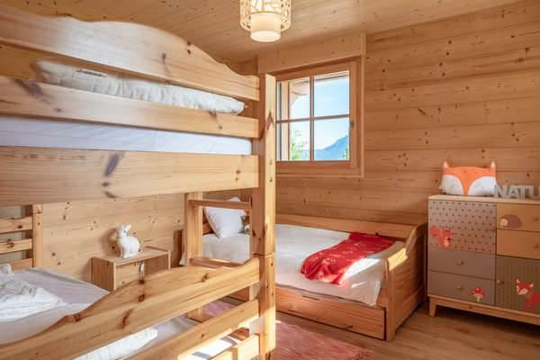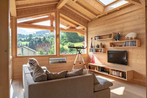 - 1er étage : Mezzanine au dessus du salon, face au Mont Blanc, 3 chambres, 2 SDD, 1 SDB, WC