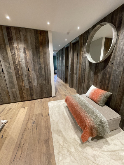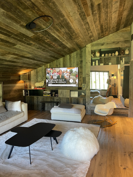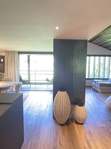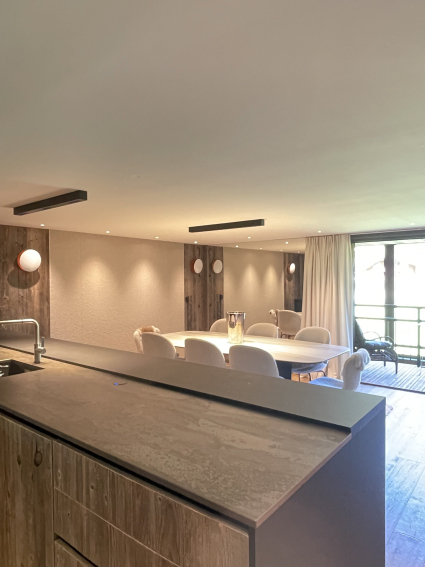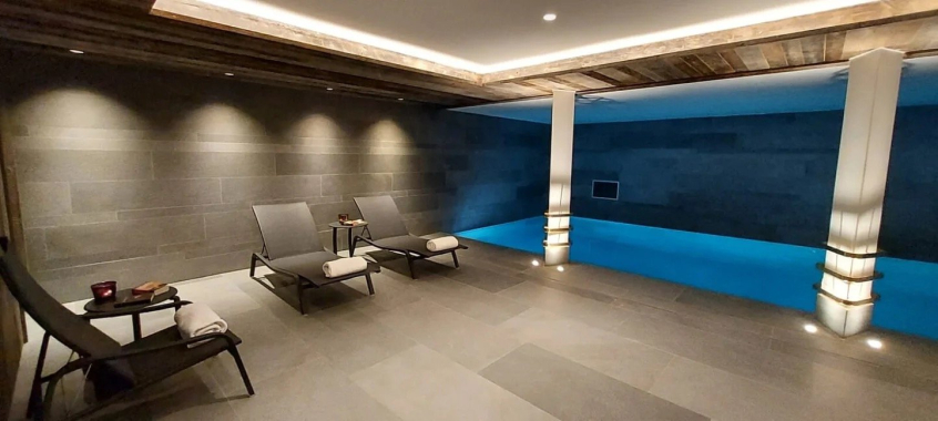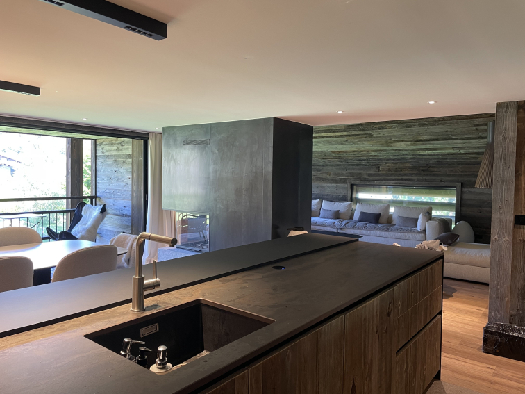 Très grande et très belle pièce de vie : avec salon, salle à manger, cuisine avec une belle vue dégagée sur le Jaillet. Espace piscine/ spa intérieur. 2 places de parking en sous sol (accessible par ascenseur à voitures). Local à ski.