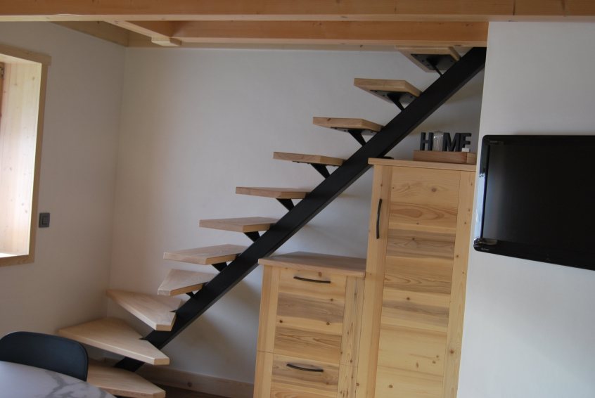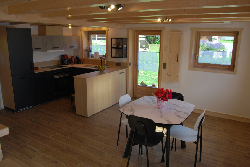 Chalet de 56 m2 au rez de chaussée : cuisine et pièce à vivre salle de bains avec wc,