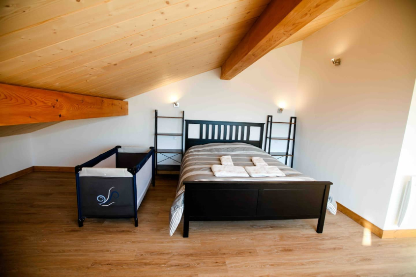 Rez-de-jardin : 3 chambres avec lit double, 1 salle d’eau, 1 WC indépendant; Dans l’une des chambres, 3 couchages supplémentaires (lit superposé & lit tiroir);