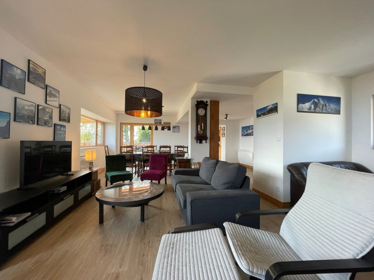 Rez-de-chaussée : Ensemble Salon – Salle à manger – Cuisine tout équipée de 70 m2, un balcon terrasse de 40 M2 avec une très belle vue sur la chaine du Mont Blanc, 1 WC, 1 salle de bain /salle d’eau, une chambre avec lit double .