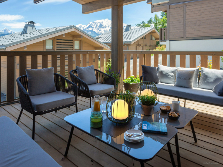 La vaste terrasse propose un coin salon abrité, une deuxième table à manger, un terrain de pétanque et un bain nordique, sorte de jacuzzi sans bulles. C’est l’endroit idéal pour admirer la silhouette charismatique du massif du Mont-Blanc.
