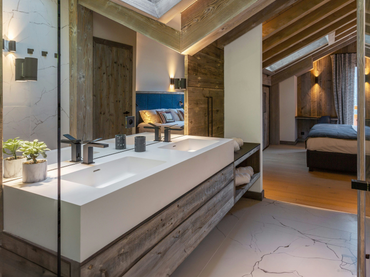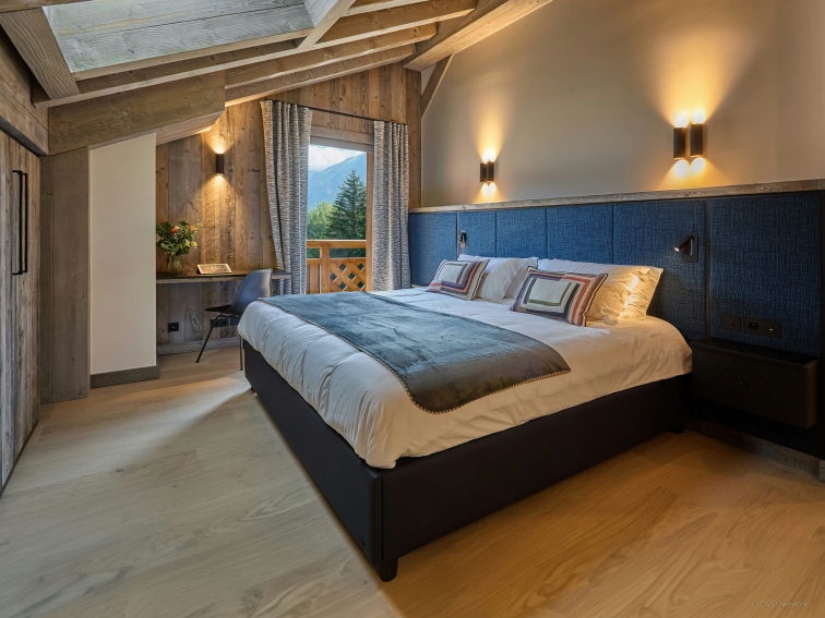 L'étage du haut compte trois chambres doubles supplémentaires, dont l’une avec sa propre salle de douche, et une autre qui peut être convertie en chambre jumelle. Deux de ces chambres donnent sur un balcon, qui bénéficie d’une vue imprenable sur le massif du Mont-Blanc !
