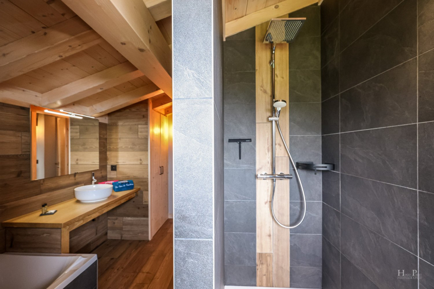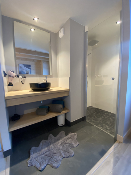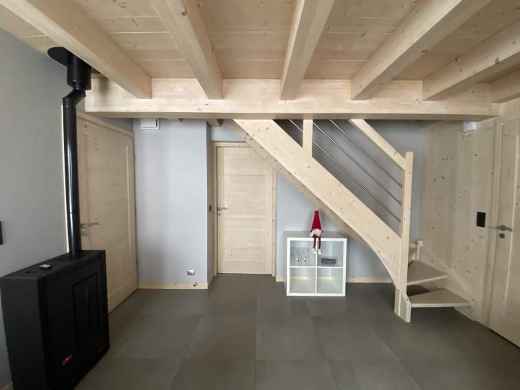 - au rez-de-chaussée : 1 espace cuisine/salon/séjour avec poêle à granulés, 1 chambre parentale (lit 180x200) avec salle de douche, 1 WC séparé, 1 ski-room avec sèche-chaussures et 1 sauna