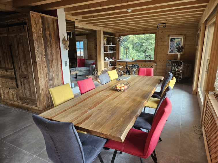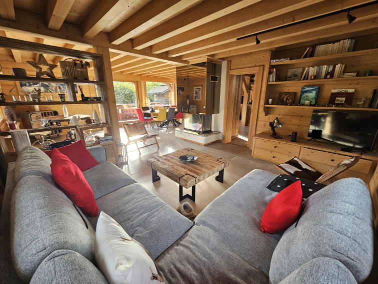 - Une grande pièce de vie (50 m2), ouverte et lumineuse (baies vitrées), table à manger pour 10 personnes, un coin salon cocooning avec cheminée et canapé neuf, une TV Live box 6 avec les chaines Canal (réception fibre). Cette pièce donne accès au jardin et dispose d'une terrasse filante avec coin repas : table et bancs extérieurs coté Mont Blanc.