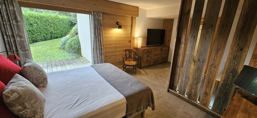 Au niveau inférieur : Une chambre en suite avec un lit double équipé d'un matelas neuf haut de gamme (160 x 200), son coin salon avec canapé lit (160) très confort, rangements, bureau avec écran plat, TV orange et les chaines Canal +, salle de douche / WC ainsi qu'un accès direct au jardin avec terrasse sur Mont Blanc.