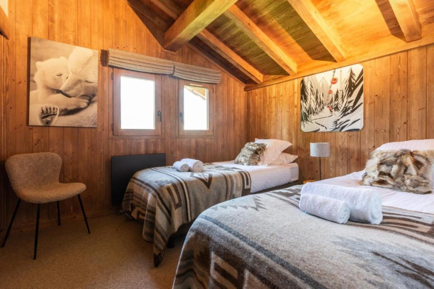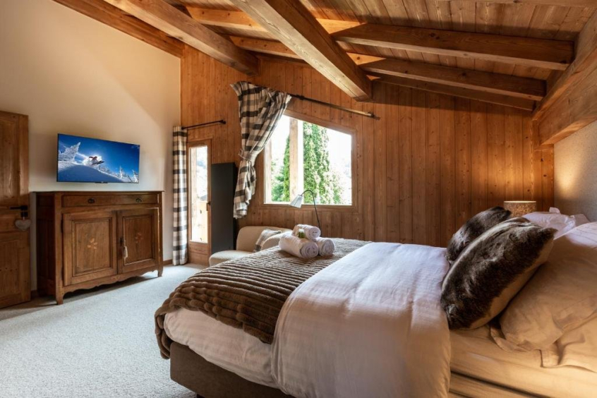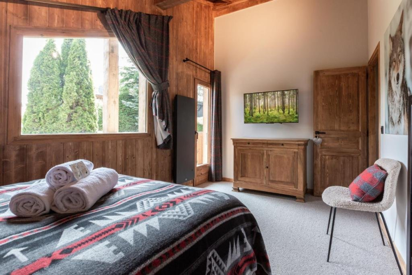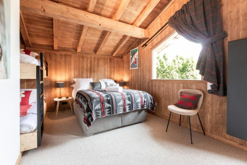 À l’étage, le chalet dispose de 3 chambres fermées avec une suite parentale avec salle d’eau attenante et balcon, une chambre familiale avec un lit king-size, deux lits superposés et un balcon et enfin une chambre avec deux lits simples.