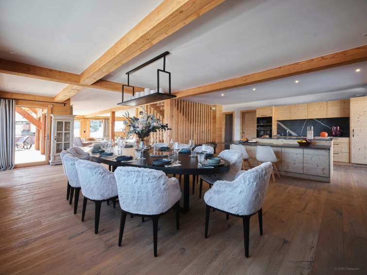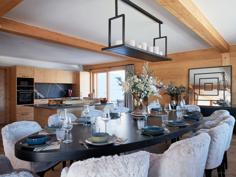 Sa grande pièce de vie ouverte constitue le cœur du chalet. Face aux montagnes, elle profite d’une belle luminosité et de balcons qui prolongent naturellement l’espace vers l’extérieur. Sa cheminée centrale réchauffera les soirées conviviales passées dans ses deux salons. La cuisine est tout équipée et la table à manger est assez grande pour accueillir toute la famille.